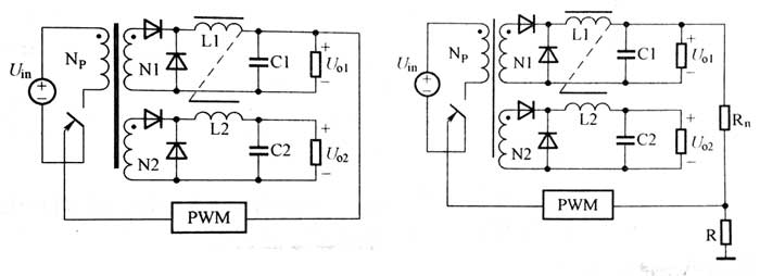 圖4-56耦合電感式多路輸圖變器原理圖 圖47電壓加權(quán)反饋式多路輸出質(zhì)器原理圖 這種電源適配器變換器的優(yōu)點主要是變換器輸出支路的整體穩(wěn)壓精度有所提高,電源適配器電路結(jié)構(gòu)比較簡單,輸出電壓最低可達到5V電源適配器左右;缺點主要是由于反饋信號是每路輸出的加權(quán)和,因此所有支路的輸出均無法得到準(zhǔn)確調(diào)節(jié),它只是通過控制加權(quán)系數(shù)改變輸出誤差在各支路的分配比例,而不能消除誤差,此例中,N=2.M=1,仍然無法使每條輸出支路都得到精確調(diào)節(jié)