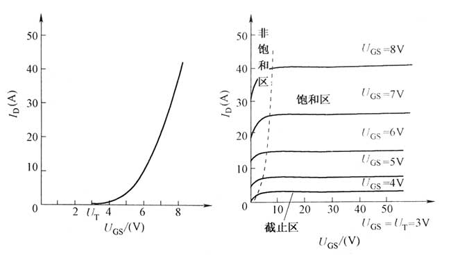 (1)靜態(tài)特性 其轉(zhuǎn)移特性和輸出特性如圖22所示