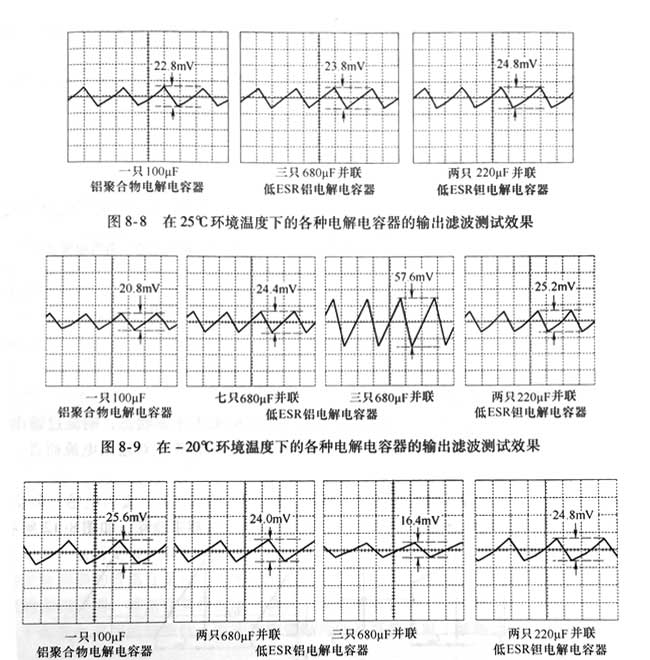 在不同的環(huán)境溫度下的測試結(jié)果分別為圖所示? 從測試結(jié)果看,在開關頻率為200kHz時,在常溫環(huán)境下,一只100μF的鋁聚合物電解電容器的濾波效果稍好于三只680μF的低ESR鋁電解電容器;稍好于兩只220μF低ESR鋁電解電容器?而在-20℃的環(huán)境下同樣的100μF鋁聚合物電解電容器的濾波效果明顯好于3只680μF低ESR鋁電解電容器,即使選用7只680μF低ESR鋁電解電容器,其效果才能接近100uF鋁聚合物電解電容器,但是還是差一些(差3.6mV,接近18%);稍好于兩只220μF低ESR電解電容器?這表明鋁電解電容器的低溫性能很差,而鉭電解電容器的低溫性能比鋁電解電容器好得多?在70℃環(huán)境溫度下兩只680uF就好于一只100μF鋁聚合物電解電容器;兩只220μF鉭電解電容器與鋁聚合物電解電容器基本相同?實驗結(jié)果表明,鋁電解電容器的性能隨溫度變化非常大,高溫時的性能非常好,常溫特性一般,低溫特性極差。