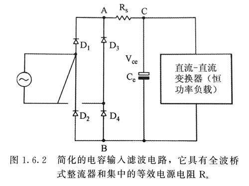 等效串聯(lián)電阻Rs 等效串聯(lián)電阻Rs,由所有串聯(lián)元件組成,包括出現(xiàn)于原邊供電充電器和儲(chǔ)能電容C5、C6之間的原邊充電器電阻。為了簡(jiǎn)化分析,將各電阻集總為一個(gè)等效電阻Rs。為了進(jìn)一步地減小峰值電流,可附加串聯(lián)電阻提供最合適的等效串聯(lián)電阻??梢钥吹秸麟娙葺斎霝V波器和儲(chǔ)能電路的性能在很大程度上取決于這種最終的最優(yōu)等效串聯(lián)電阻。 圖所示為橋電路的一種簡(jiǎn)化形式。在此簡(jiǎn)化電路中,串聯(lián)的儲(chǔ)能電容C5和C6由等效電容C來(lái)代替,并且等效串聯(lián)電阻R,被置于橋式整流器的輸出端來(lái)進(jìn)一步簡(jiǎn)化分析。 在圖所示的實(shí)例中,等效串聯(lián)電阻由以下部分組成。