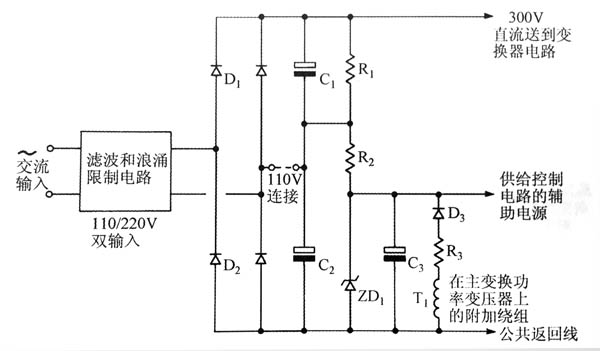 當(dāng)變換器工作時(shí),輔助充電器從主變壓器T1的一個(gè)繞組獲得補(bǔ)償,避免了C3進(jìn)一步地電并保持輔助充電器電壓穩(wěn)定。 對(duì)這種方法的主要要求是要有足夠的啟動(dòng)延時(shí),讓主變換器允許C3完全充電。再者,為了正確啟動(dòng)變換器,C3必須足夠大以存儲(chǔ)足夠的能量供給驅(qū)動(dòng)電路。 在此電路中,R1和R2始終存在于電路中。為了防止過多的損耗,它們的阻值必須很大,因此在變換器啟動(dòng)之前,驅(qū)動(dòng)電路的待機(jī)電流必須很低。因?yàn)镃3可能相當(dāng)大,在C3充滿電之前可能有200ms~300ms的延時(shí),為了在第一個(gè)周期運(yùn)行中確保良好的開關(guān)動(dòng)作,C3必須在啟動(dòng)之前充滿電,這就要求在啟動(dòng)控制和驅(qū)動(dòng)電路中有低壓禁止和延時(shí)的措施。 這種技術(shù)的優(yōu)點(diǎn)是價(jià)格非常低,并且電阻R1和R2能代替儲(chǔ)能電容C1和C2兩端必不可少的普通安全放電電阻。