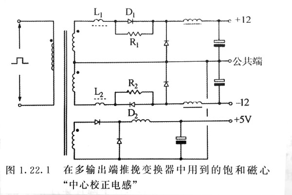 當(dāng)變換變壓器有多個繞組用來提供輔助輸出電壓時,要獲得正確的輸出電壓有時會出現(xiàn)一些問題。變壓器的繞組只能以一匝為單位進(jìn)行調(diào)整,如第三部分第4章有時可以是半匝,因此變壓器不能利用所有的繞組輸出精確的電壓值。 當(dāng)采用輸出輔助電源適配器時(通常是三端串聯(lián)調(diào)節(jié)器),副邊輸出電壓誤差通??梢詽M足要求。但是在很多場合下輔助電源適配器并沒有附加電壓調(diào)節(jié)器但又需要能夠?qū)敵鲭妷哼M(jìn)行中心校正(把輸出電壓設(shè)置到一個絕對值上)。 接下來介紹用飽和電抗器的無損耗方法進(jìn)行電壓調(diào)整的電路。