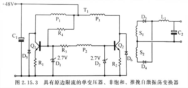該電路中,集電極電流峰值由選擇的發(fā)射極電阻和鉗位齊納電壓決定,關(guān)斷時(shí)的最大限制電流不再取決于晶體管增益。 圖電路的整個(gè)工作過(guò)程如下。合上開(kāi)關(guān),流經(jīng)R的電流使Q1開(kāi)始導(dǎo)通,P2產(chǎn)生的正反饋將加強(qiáng)該導(dǎo)通過(guò)程,Q1進(jìn)入全導(dǎo)通的飽和狀態(tài)。 從P2通過(guò)R3、Q1基-射結(jié)、R1,經(jīng)D2返回建立的驅(qū)動(dòng)電流回路,其作用就像一個(gè)正向二極管。較大的驅(qū)動(dòng)電流值使晶體管在整個(gè)導(dǎo)通期間都處于完全飽和狀態(tài)。 Q1導(dǎo)通時(shí),集電極電流將隨時(shí)間增加,其大小由原邊電感、折算過(guò)來(lái)的副邊電感L和負(fù)載決定。 隨著電流增加,R1兩端的電壓和Q1基級(jí)電壓也增加,直到齊納二極管導(dǎo)通。 合理選擇R1的值,使集電極電流達(dá)到最大控制值時(shí)切斷驅(qū)動(dòng)電流,此時(shí)磁心正好進(jìn)入飽和點(diǎn),即圖中的點(diǎn)S1’。由于達(dá)到鉗位電流時(shí)H不能夠進(jìn)一步增加,所以所有繞組兩端的電壓必須下降到零,最終只需要非常小的反激作用使Q1關(guān)斷和Q2導(dǎo)通Q2繼續(xù)完成工作周期。集電極限制電流不再取決于晶體管增益。 當(dāng)折算過(guò)來(lái)的負(fù)載電流低于磁化電流時(shí),接在集電極上的二極管D5和D6為反向電流提供通路。這兩個(gè)二極管以交叉連接方式工作,例如,Q1關(guān)斷時(shí),磁化電流將使Q1的集電極迅速變正。同時(shí),Q2的集電極迅速變負(fù),直到D6導(dǎo)通。D6提供的錯(cuò)位作用使Q1集電極電壓是Vcc的兩倍。為減小漏感的影明,P1和P3應(yīng)該采用雙股線繞制。 為減少射頻干擾和副邊擊穿應(yīng)力,除了D5和D6外還需要緩沖電路。 為保證良好的開(kāi)關(guān)作用,需要有足夠的再生反饋,所示電路中P2應(yīng)提供至少4伏的驅(qū)動(dòng)電壓。