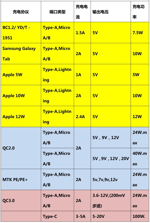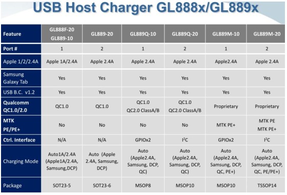 例如: 一個USB口最大的承載電流為2A,當充電器輸出為5V時,充電的功率為10W;如果提升電壓到20V,電流依然為2A,則充電的功率為20W,可以減少四倍的充電時間。 四、通用充電器: 因各個廠家生產(chǎn)的手機端口各不相同,充電器的協(xié)議也沒有統(tǒng)一;做一個通用的充電器需要有“充電端口識別的芯片”來兼容各個廠家的智能設(shè)備。如何GenesysLogic公司的GL889M-10芯片。 1、以下是部分充電協(xié)議圖表: ![]() 2、以下是支持不同充電協(xié)議的識別芯片說明: ![]()