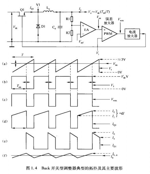 Buck開關(guān)型調(diào)整器 串接晶體管的高功耗和笨重的工頻變壓器使得線性調(diào)整器在現(xiàn)代電子應(yīng)用中失去了重要地位。而且,高功耗串接元件需要的大散熱片和大體積儲(chǔ)能電容增大了線性調(diào)整器的體積。隨著電子技術(shù)的發(fā)展,電路的集成化使得電路系統(tǒng)的體積更小。一般的線性調(diào)整器輸出負(fù)載的功率密度僅為0.2~0.3W/in3,不能滿足電路系統(tǒng)小型化的要求。而且,線性電源適配器不能夠提供數(shù)字存儲(chǔ)系統(tǒng)所需要的足夠長(zhǎng)的保持時(shí)間。 取代線性調(diào)整器的開關(guān)型調(diào)整器早在20世紀(jì)60年代就開始應(yīng)用。一般的,這些新的15W電源適配器使用開關(guān)晶體管將輸入直流電壓斬波成方波。方波由占空比調(diào)節(jié),并通過(guò)低通輸出功率濾波得到直流輸出電壓。 濾波器一般采用電感和輸出電容。通過(guò)調(diào)節(jié)占空比,可以控制經(jīng)過(guò)輸出電容濾波的電壓平均值。方波脈沖經(jīng)過(guò)低通濾波器濾波后得到的直流輸出電壓等于方波脈沖的平均值Buck開關(guān)型調(diào)整器典型的拓?fù)浼捌洳ㄐ稳鐖D所示。 使用合適的LC濾波器可將方波脈沖平滑成無(wú)紋波直流輸出,其值等于方波脈沖的平均值。整個(gè)電路采用輸出負(fù)反饋,通過(guò)檢測(cè)輸出電壓并結(jié)合負(fù)反饋控制占空比,穩(wěn)定輸出電壓不受輸入網(wǎng)壓和負(fù)載變化的影響。 目前高頻開關(guān)電源適配器的功率密度可達(dá)20W/in3,而且可以獲得與輸入隔離的多組輸出。它們無(wú)需工頻變壓器,效率達(dá)到75%~95%。有些DC/DC變換器功率密度可高達(dá)50w/in3 Buck調(diào)整器的基本符號(hào)和波形 補(bǔ)充: 電源適配器廠家介紹了以下開關(guān)型調(diào)整器的恒頻工作方式,在這類調(diào)整器中,功率器件的導(dǎo)通時(shí)間(Ton)是可調(diào)的,而整個(gè)開關(guān)周期(T)是固定的,即開關(guān)頻率(1/T)也是固定的。 比例Ton/T一般稱為占空比。在某些書中,占空比用Ton/(Ton+Toff)表示,其中Toff是功率器件的關(guān)斷時(shí)間,因此Ton+Toff=T。 除了恒頻工作方式,還有導(dǎo)通時(shí)間固定而頻率可調(diào)的工作方式,或者導(dǎo)通時(shí)間和頻率均可調(diào)的工作方式。 dl、di、dV、dv、dT和dt的用法不是很嚴(yán)格,一般用來(lái)表示△l、△V和△的變化量。例如,△∥△t用導(dǎo)數(shù)d/dt表述,表示電流相對(duì)時(shí)間的變化量或波形的斜率。 12w電源適配器Buck調(diào)整器的基本工作方式 Buck調(diào)整器的基本電路如圖1。4所示。晶體管Q1與直流輸入電壓V串聯(lián),通過(guò)Q1硬開通和硬關(guān)斷,在V1處產(chǎn)生方波電壓。采用恒頻控制方式,占空比可調(diào),Q1導(dǎo)通時(shí)間為T。Q1導(dǎo)通時(shí),V1點(diǎn)電壓為V(設(shè)Q1導(dǎo)通,壓降為零),電流通過(guò)串接電感L流入輸出端。Q1關(guān)斷時(shí),電感L產(chǎn)生反電動(dòng)勢(shì),使V1點(diǎn)電壓迅速下降到零,并變負(fù)值直至被二極管D1(也稱續(xù)流二極管)鉗位于-0.8V。 設(shè)此刻二極管D壓降也為零,則V點(diǎn)電壓波形為矩形波,如圖所示,T時(shí)段電壓為V,其余時(shí)段電壓為零。該方波的電壓平均值為V7/7。LC濾波器接于Ⅵ和V之間,它使輸出點(diǎn)V成為幅值等于V7。/7的無(wú)尖峰無(wú)紋波的直流電壓。 采樣電阻R和R2檢測(cè)輸出電壓V,并將其輸入誤差放大器(EA)與參考電壓V進(jìn)行比較。被放大的誤差電壓V被輸入到脈寬調(diào)制器(電壓比較器)PWM。PWM比較器的另一個(gè)輸入是周期為T的鋸齒波,如圖所示,其幅值一般為3V。PWM電壓比較器產(chǎn)生矩形波脈沖,即圖(c)中的V=,它從鋸齒波起點(diǎn)開始到鋸齒波與誤差放大器輸出電壓交點(diǎn)結(jié)束。因此,PwM輸出的脈沖寬度T=與誤差放大器輸出電壓成比例。 PWM脈沖輸入到電流放大器并以負(fù)反饋方式控制開關(guān)管Q1的通斷。其邏輯關(guān)系是:若輸入電壓V稍升高,則EA輸出電壓V將降低使鋸齒波與V交點(diǎn)提前,Q1導(dǎo)通時(shí)間T??s短使輸出電壓V0=VdcTon/T保持不變。同理,若V下降,則導(dǎo)通時(shí)間7正比的延長(zhǎng)使保持不變。Q1導(dǎo)通時(shí)間的改變使采樣電壓總是等于參考電壓,即V0R2/(R2+R1)=Vref。 ![]()