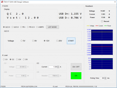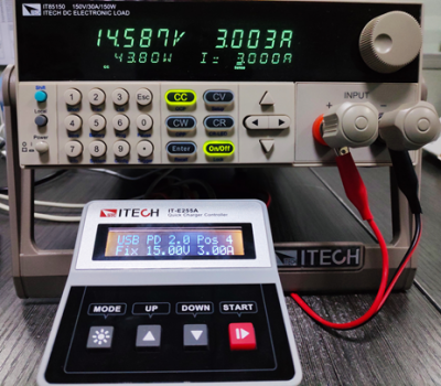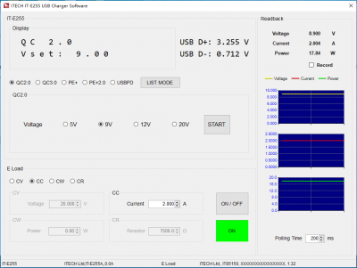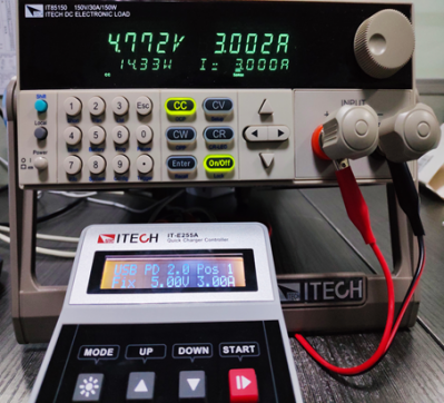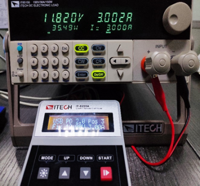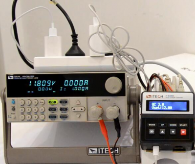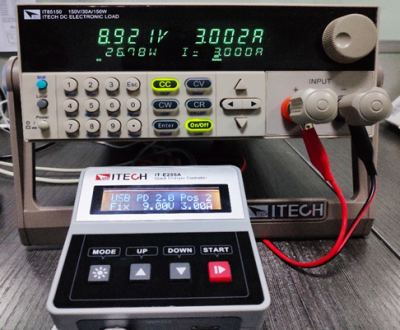 | 今年是USB 充電器爆發(fā)的一年。無論是手機、平板、還是筆記本電腦,越來越多的消費類電子產(chǎn)品都不約而同的用上了TYPE-C接口,支持USB PD充電協(xié)議。 一款快充充電器好不好,首當其沖的肯定是兼容情況,其次是輸出帶載能力。 最近購買一款小米45W的PD充電器,同時兼容QC2.0、QC3.0快充協(xié)議。 市面上多數(shù)電子負載并不支持快充協(xié)議,而艾德克斯電子新出的IT-E255A快充控制盒卻可以搭配目前多數(shù)電子負載進行快充協(xié)議的測試。 這個小小的快充控制盒不僅支持QC2.0/QC3.0/PE/PE2.0/USB PD,更重要的是竟然可以和艾德克斯的IT8500+系列的電子負載通信,設(shè)定負載的拉載模式和拉載值。 下面就和小伙伴們一起分享小米USB-C充電器的測試。 1.開始準備階段 IT-E255A的輸入口有Mini-USB和TYPE-C 2個接口。 充電器插入口,IT-E255A連上電子負載,測試就可以開始嘍。 1.1 IT-E255A自動進行充電器協(xié)議檢測,Type-C輸出口支持USB PD2.0 、QC3.0、QC2.0三種快充協(xié)議。 1.2 從IT-E255A顯示屏中可以看出,小米USBPD充電器的快充協(xié)議版本為2.0,支持5V/3A、9V/3A、12V/3A、15V/3A、20V/2.25A五個輸出檔位。 1.3 在5V/3A、9V/3A、12V/3A、15V/3A、20V/2.25A五個PD輸出檔位,分別拉載最大的電流,測試其在不同檔位下輸出的電壓和輸出功率。 ![]() 歐規(guī)充電器測試接線圖(小米充電器+ 艾德克斯IT-E255A + 艾德克斯IT85150) USB PD 2.O POS1 5V/3A ![]() USB PD 2.O POS2 9V/3A ![]() USB PD 2.O POS3 12V/3A ![]() USB PD 2.O POS4 15V/3A ![]() USB PD 2.O POS5 20V/2.25A ![]() 2.手動按鍵按下“Mode”,選擇QC3.0,點擊“START”,IT-E255A則可誘導(dǎo)小米USB-C充電器從5.0V開始以0.2V的步進值步進,充電器可按照快充控制盒的設(shè)定值輸出。 2.1 在QC3.0模式下,誘導(dǎo)充電器輸出6.0V、7.0V、8.0V、9.0V,分別使用電子負載恒流模式拉載,測試其電壓、輸出功率。 ![]() 3. 如果不喜歡手動操作,還可以使用上位機軟件控制。 使用USB數(shù)據(jù)線將IT-E255A和計算機相連。下載相應(yīng)免安裝的上位機軟件,打開后就可以使用。 下面做了兩個測試:QC2.0 9.0V輸出: QC2.0 12.0V輸出: ![]() 操作清晰簡易,可以顯示拉載的電壓、電流、功率的波形曲線,自由控制電子負載, 另外還可以設(shè)置list自動測試,快速進行判斷、OCP測試等。此外還可以下載到快充控制盒中,與電腦脫機使用,一鍵操作,非常快捷。