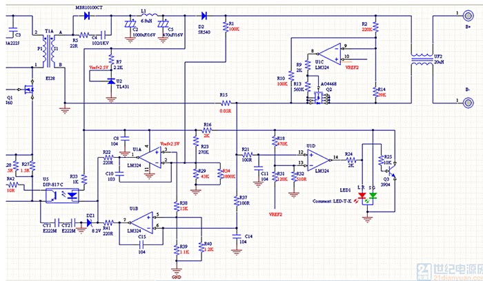 R29 43K和R34 1800K,并聯(lián)起來約為42K,則恒壓 LM324的2腳電壓8.4/(100+42)*42=2.48V,與LM324的3腳2.5V比較