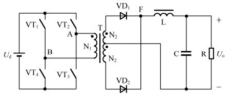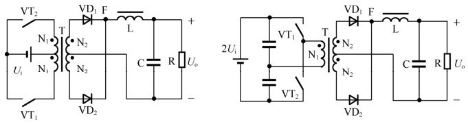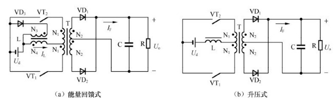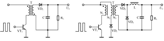 | 電源適配器變換器的拓?fù)浣Y(jié)構(gòu)是指能用于轉(zhuǎn)換、控制和調(diào)節(jié)輸入電壓的功率開關(guān)器件和儲能元件的不同配置。電源適配器變換器的拓?fù)浣Y(jié)構(gòu)可分為兩種基本類型:非隔離型(在工作期間輸入源和輸出負(fù)載共用一個共同的電流通路)和隔離型(能量轉(zhuǎn)換是用一個相互耦合的磁性元件變壓器來實(shí)現(xiàn)的,而且從源到負(fù)載的耦合是借助于磁通而不是共同的電流回路)。變換器拓?fù)浣Y(jié)構(gòu)是根據(jù)系統(tǒng)造價(jià)、性能指標(biāo)和輸入/輸出負(fù)載特性諸因素選定的。 1.非隔離開關(guān)變換器 非隔離開關(guān)變換器有4種基本拓?fù)浣Y(jié)構(gòu)用于DC/DC變換器。 (1)降壓拓?fù)浣Y(jié)構(gòu) 降壓式電源適配器的典型電路如圖1-5所示。當(dāng)開關(guān)管VT1導(dǎo)通時(shí),二極管VD1截止,輸入的整流電壓經(jīng)VT1和L向C充電,這一電流使電感L中的儲能增加。當(dāng)開關(guān)管VT1截止時(shí),電感L感應(yīng)出左負(fù)右正的電壓,并經(jīng)負(fù)載RL和續(xù)流二極管VD1釋放存儲的能量,維持直流輸出電壓不變。電路輸出的直流電壓的高低由加在VT1基極上的脈沖寬度確定。 這種電路所用元件少,它同下面介紹的另外兩種電路一樣,只需要利用電感、電容和二極管即可實(shí)現(xiàn)。降壓變換器將輸入電壓變換成較低的穩(wěn)定的輸出電壓。輸出電壓(Uo)和輸入電壓(Ui)的關(guān)系為: ![]() (2)升壓拓?fù)浣Y(jié)構(gòu) 升壓式電源適配器的典型電路如圖1-6所示。當(dāng)開關(guān)管VT1導(dǎo)通時(shí),電感L儲存能量。當(dāng)開關(guān)管VT1截止時(shí),電感L感應(yīng)出左負(fù)右正的電壓,該電壓疊加在輸入電壓上,經(jīng)二極管VD1向負(fù)載供電,使輸出電壓大于輸入電壓,形成升壓式電源適配器。升壓變換器將輸入電壓變換成較高的穩(wěn)定的輸出電壓。輸出電壓和輸入電壓的關(guān)系為: ![]() 降壓式電源適配器 ![]() (3)逆向拓?fù)浣Y(jié)構(gòu) 逆向變換器將輸入電壓變換成較低的反相輸出電壓。輸出電壓與輸入電壓的關(guān)系為: ![]() (4)反轉(zhuǎn)式拓?fù)浣Y(jié)構(gòu) 反轉(zhuǎn)式電源適配器的典型電路如圖1-7所示。這種電路又稱為升降壓式電源適配器。無論開關(guān)管VT1之前的脈動直流電壓是高于還是低于輸出端的穩(wěn)定電壓,電路均能正常工作。 ![]() 圖反轉(zhuǎn)式電源適配器 當(dāng)開關(guān)管VT1導(dǎo)通時(shí),電感L儲存能量,二極管VD1截止,負(fù)載RL靠電容C上的充電電荷供電。當(dāng)開關(guān)管VT1截止時(shí),電感L中的電流繼續(xù)流通,并感應(yīng)出上負(fù)下正的電壓,經(jīng)二極管VD1向負(fù)載供電,同時(shí)給電容C充電。 反轉(zhuǎn)式變換器將輸入電壓變換成穩(wěn)定的較低的反相電壓或較高的輸出電壓(電壓值取決于占空比)。輸出電壓和輸入電壓的關(guān)系為: ![]() 2.隔離式開關(guān)變換器 隔離式開關(guān)變換器的拓?fù)浣Y(jié)構(gòu)有很多種,但其中3種比較通用,它們是逆向變換器、正向變換器和推挽變換器。在這些電路中,從輸入電源適配器到負(fù)載的能量轉(zhuǎn)換是通過一個變壓器磁通耦合或其他磁性元件實(shí)現(xiàn)的。 (1)推挽型變換器與半橋型變換器 推挽型變換器與半橋型變換器是典型的逆變整流型變換器,電路結(jié)構(gòu)如圖1-8所示。加在變壓器一次繞組上的電壓為幅度等于輸入電壓Ui、寬度為開關(guān)導(dǎo)通時(shí)間ton的脈沖波形,變壓器二次電壓經(jīng)二極管VD1、VD2全波整流變?yōu)橹绷鳌?br /> ![]() 圖推挽型與半橋型變換電路 推挽式電源適配器的典型電路如圖(a)所示。它屬于雙端式變換電路,高頻變壓器的磁芯工作在磁滯回線的兩側(cè)。該電路使用兩個開關(guān)管VT1和VT2,兩個開關(guān)管在外激勵方波信號的控制下交替導(dǎo)通與截止,在變壓器T的次級統(tǒng)組得到方波電壓,經(jīng)整流濾波變?yōu)樗枰闹绷麟妷骸?br /> 這種電路的優(yōu)點(diǎn)是兩個開關(guān)管容易驅(qū)動,主要缺點(diǎn)是開關(guān)管的耐壓要達(dá)到電路峰值電壓的兩倍。電路的輸出功率較大,一般為100~500W。 圖(b)所示為半橋型變換器的電路結(jié)構(gòu)。如只從輸出側(cè)濾波器來看,其工作原理和降壓型變換器完全相同,二次側(cè)濾波電感用于存儲能量。電壓變換比m與降壓型變換器相類似,即: ![]() 式中:n為變壓器的匝數(shù)比,n=N1/N2;N1為一次繞組的匝數(shù);N2為二次繞組的匝數(shù)。 (2)單端激勵型變換器 ①單端反激式電源適配器。單端反激式電源適配器的典型電路如圖1-9(a)所示。所謂的單端是指高頻變換器的磁芯僅工作在磁滯回線的一側(cè)。所謂的反激是指當(dāng)開關(guān)管VT1導(dǎo)通時(shí),高頻變壓器T初級繞組的感應(yīng)電壓為上正下負(fù),整流二極管VD1處于截止?fàn)顟B(tài),在初級繞組中儲存能量。當(dāng)開關(guān)管VT1截止時(shí),變壓器T初級繞組中存儲的能量通過次級繞組及VD1整流和電容C濾波后向負(fù)載輸出。單端反激式電源適配器是一種成本最低的電源適配器電路,輸出功率為20~100W,可以同時(shí)輸出不同的電壓,且有較好的電壓調(diào)整率;唯一的缺點(diǎn)是輸出的紋波電壓較大,外特性差,適用于相對固定的負(fù)載。 單端反激式電源適配器使用的開關(guān)管VT1承受的最大反向電