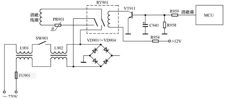 | 電源適配器在高電壓下,較大功率的電源適配器同時(shí)也工作在大電流狀態(tài)下,并且受到浪涌電流和高壓脈沖的威脅,加之電源適配器電路復(fù)雜,因此,電源適配器除了一般電子線路外,還要設(shè)置多種特殊保護(hù)電路,以此保證電源適配器穩(wěn)定工作。 消磁電路 地磁和外部磁場會影響一些電器的正常工作,因此,一些特殊的電器,如CRT彩電、CRT顯示器等,其電源適配器中會設(shè)有消磁電路。 消磁電路的主要元件是消磁電阻,消磁電阻是一種正溫度系數(shù)(PTC)的熱敏電阻,用于對顯像管的消磁。其阻值能隨溫度升高而迅速增大。利用PTC熱敏電阻充當(dāng)消磁元件,具有節(jié)能、安全、方便、低成本的特點(diǎn)。 地磁和外界各種雜散磁場對彩色顯像管有磁化作用,顯像管的蔭罩、柵網(wǎng)、防爆環(huán)、外屏蔽罩和固定件極容易被磁化。磁化的結(jié)果將改變電子束軌跡,使色純不良,并引起會聚誤差,有時(shí)甚至使屏幕上出現(xiàn)明顯的色斑。為了克服地磁場、周圍雜散磁場以及機(jī)內(nèi)金屬零部件形成的磁場對顯像管內(nèi)電子束的影響,設(shè)有一套消磁電路。該電路在每次開機(jī)時(shí),產(chǎn)生一個(gè)由強(qiáng)變?nèi)醯慕蛔兇艌觯瑢︼@像管金屬部件進(jìn)行消磁。 消磁電路主要有常規(guī)消磁電路和MCU控制消磁電路兩種,下面分別進(jìn)行介紹。 1.常規(guī)消磁電路 常規(guī)消磁電路由PTC熱敏電阻和消磁線圈構(gòu)成。圖是常規(guī)消磁電路原理圖。 ![]() 將消磁電阻、消磁線圈串聯(lián)后裝在顯像管防爆帶附近,開機(jī)通過高達(dá)20A的起始電流而迅速發(fā)熱,并使其自身阻值突變增高,30s后的殘余電流值降低至10mA以下,使消磁電路產(chǎn)生一個(gè)逐漸衰減的交變強(qiáng)磁場,達(dá)到消除熒屏剩磁的目的。 2.MCU控制消磁電路 MCU(微控制器)控制消磁電路是一種新式消磁電路,它是在常規(guī)消磁電路的基礎(chǔ)上增加了一個(gè)消磁控制電路,該控制電路工作時(shí)間由MCU單獨(dú)設(shè)置的控制端子進(jìn)行控制。圖2-15所示為MCU控制消磁電路原理圖。 ![]() 圖MCU控制消磁電路原理圖 在接通電源適配器開關(guān)后,MCU進(jìn)入工作狀態(tài),其消磁控制端輸出高電平消磁信號,三極管VT911導(dǎo)通,繼電器線圈得電,繼電器常開觸點(diǎn)閉合,將消磁電阻、消磁線圈接入市電回路中,于是,市電電壓經(jīng)消磁電阻限流,在消磁線圈中產(chǎn)生交變磁場,對顯像管及其附件進(jìn)行消磁。數(shù)秒后,MCU消磁控制端為低電平,控制電路停止工作,使消磁回路被切斷。這樣不但降低了消磁電阻的故障率,而且提高了消磁電路的工作效率。