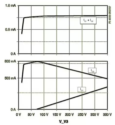 七、浮動(dòng)恒流源允許超寬范圍的輸入電壓 對(duì)Power Integrations的多數(shù)產(chǎn)品而言,數(shù)據(jù)手冊(cè)中限制的用于確保正常啟動(dòng)和起作用的小漏極電壓為50 V。但是,如果通過(guò)外部電源向旁路引腳饋電,則芯片可接收外部供電,且即使在較低的輸入電壓下也可啟動(dòng)和工作。 ![]() 圖8所示的啟動(dòng)電路為浮動(dòng)恒流源,它為整個(gè)輸入電壓范圍內(nèi)的 TinySwitch-III 的旁路(BP)引腳提供大約 600 μA 的恒流。恒流值由 R2 和 VR1 確定: ![]() 該電路源自基本的單晶體管電流源。該電路采用了一個(gè)齊納二極管,為 Q2 (NPN)的基極引出端設(shè)置參考電壓,并以此對(duì)流經(jīng)電阻 R2 的固定電壓進(jìn)行編程,從而設(shè)置恒流值。然而,鑒于輸入電源范圍的異常寬廣性,參考齊納二極管的偏置電流在很大范圍內(nèi)會(huì)有所差異。這將導(dǎo)致功率耗散增加及編程的恒流發(fā)生偏移。 要克服上述難題,需要由其他的電流源(由 Q1 (PNP)與 R1 形成)提供偏置電流。將等同于VBE 的恒壓強(qiáng)加于 R1,這樣可為整個(gè)工作范圍內(nèi)的參考齊納二極管提供偏置電流補(bǔ)償。 晶體管 Q2 以較低輸入電壓提供恒流,而 Q1 則以較高的輸入電壓提供恒流。圖 2 顯示了電流流經(jīng) Q1 和 Q2 時(shí)的模擬結(jié)果。輸入電壓達(dá)到大約 50 VDC 時(shí),Q2 將提供恒流。輸入電壓達(dá)到50 VDC 及以上時(shí),經(jīng)過(guò) Q2 的電流將減弱,而經(jīng)過(guò) Q1 的電流則呈線性增加。輸入電壓達(dá)到大值 375 VDC 時(shí),則主要由 Q1 提供恒流。R3 用于限制整個(gè)電路在輸入電壓大時(shí)的輸入電流。 ![]() 非線性電流由于齊納二極管 VR1 的非線性活動(dòng)而上升。輸入電壓大約為 60 VDC 時(shí),齊納二極管開(kāi)始有電壓。 八、用軟啟動(dòng)禁止低成本輸出來(lái)遏制電流尖峰 為滿足嚴(yán)格的待機(jī)功耗規(guī)范要求,一些多路輸出電源被設(shè)計(jì)為在待機(jī)信號(hào)為活動(dòng)狀態(tài)時(shí)斷開(kāi)輸出連接。通常情況下,通過(guò)關(guān)閉串聯(lián)旁路雙極晶體管(BJT)或 MOSFET 即可實(shí)現(xiàn)上述目的。對(duì)于低電流輸出,如果在設(shè)計(jì)電源變壓器時(shí)充分考慮到晶體管的額外壓降情況,則 BJT 可成為 MOSFET 的合適替代品,且成本更為低廉。 圖 1 0所示為簡(jiǎn)單的 BJT 串聯(lián)旁路開(kāi)關(guān),電壓為 12 V,輸出電流強(qiáng)度為 100 mA,并帶有一超大電容(CLOAD)。晶體管 Q1 為串聯(lián)旁路元件,由 Q2 根據(jù)待機(jī)信號(hào)的狀態(tài)來(lái)控制其開(kāi)關(guān)。電阻 R1 的值是額定的,這樣可確保 Q1 有足夠的基值電流在小 Beta 和大的輸出電流下以飽和的狀態(tài)工作。PI 建議額外添加一個(gè)電容器(Cnew),用以調(diào)節(jié)導(dǎo)通時(shí)的瞬態(tài)電流。如果不添加 Cnew,Q1 在導(dǎo)通后即迅速進(jìn)入電容性負(fù)載,并因而產(chǎn)生較大的電流尖峰。為調(diào)節(jié)該瞬態(tài)劍鋒,需要增加VT1的容量,這便導(dǎo)致了成本的增加。 用作 Q1 額外“密勒電容”的 Cnew 可以消除電流尖峰。該額外電容可限制 Q1 集電極的 dv/dt值。dv/dt 值越小,流入 Cload 的充電電流就越少。為 Cnew 指定電容值,使得 Q1 的理想輸出 dv/dt 值與 Cnew 值相乘等于流入 R1 的電流。