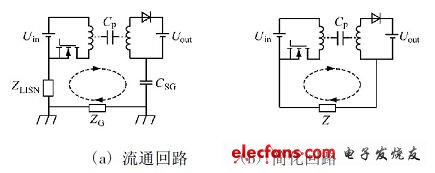 | 一、高頻變壓器與EMI 高頻變壓器中傳導(dǎo)EMI產(chǎn)生機(jī)理以反激式變換器為例,其主電路如圖1所示。 開關(guān)管開通后,變壓器一次側(cè)電流逐漸增加,磁芯儲(chǔ)能也隨之增加。當(dāng)開關(guān)管關(guān)斷后,二次側(cè)整流二極管導(dǎo)通,變壓器儲(chǔ)能被耦合到二次側(cè),給負(fù)載供電。 ![]() 圖1反激變換器 在開關(guān)電源中,輸入整流后的電流為尖脈沖電流,開關(guān)開通和關(guān)斷時(shí)變換器中電壓、電流變化率很高,這些波形中含有豐富的高頻諧波。另外,在主開關(guān)管開關(guān)過程和整流二極管反向恢復(fù)過程中,電路的寄生電感、電容會(huì)發(fā)生高頻振蕩,以上這些都是電磁干擾的來源。開關(guān)電源中存在大量的分布電容,這些分布電容給電磁干擾的傳遞提供了通路,如圖2所示。圖2中,LISN為線性阻抗穩(wěn)定網(wǎng)絡(luò),用于線路傳導(dǎo)干擾的測(cè)量。干擾信號(hào)通過導(dǎo)線、寄生電容等傳遞到變換器的輸入、輸出端,形成了傳導(dǎo)干擾。變壓器的各繞組之間也存在著大量的寄生電容,如圖3所示。圖3中,A、B、C、D4點(diǎn)與圖1中標(biāo)識(shí)的4點(diǎn)相對(duì)應(yīng)。 ![]() 圖2反激式開關(guān)電源寄生電容典型的分布 ![]() 圖3變壓器中寄生電容的分布 在圖1所示的反激式開關(guān)電源中,變換器工作于連續(xù)模式時(shí),開關(guān)管VT導(dǎo)通后,B點(diǎn)電位低于A點(diǎn),一次繞組匝間電容便會(huì)充電,充電電流由A流向B;VT關(guān)斷后,寄生電容反向充電,充電電流由B流向A。這樣,變壓器中便產(chǎn)生了差模傳導(dǎo)EMI。同時(shí),電源元器件與大地之間的電位差也會(huì)產(chǎn)生高頻變化。由于元器件與大地、機(jī)殼之間存在著分布電容,便產(chǎn)生了在輸入端與大地、機(jī)殼所構(gòu)成回路之間流動(dòng)的共模傳導(dǎo)EMI電流。 具體到變壓器中,一次繞組與二次繞組之間的電位差也會(huì)產(chǎn)生高頻變化,通過寄生電容的耦合,從而產(chǎn)生了在一次側(cè)與二次側(cè)之間流動(dòng)的共模傳導(dǎo)EMI電流。交流等效回路及簡(jiǎn)化等效回路如圖4所示。圖4中:ZLISN為線性阻抗穩(wěn)定網(wǎng)絡(luò)的等效阻抗;CP為變壓器一次繞組與二次繞組間的寄生電容;ZG為大地不同點(diǎn)間的等效阻抗;CSG為輸出回路與地間的等效電容;Z為變壓器以外回路的等效阻抗。 ![]() 圖4變壓器中共模傳導(dǎo)EMI的流通回路 二、變壓器中EMI代表的是什么 變壓器中EMI代表的是電磁干擾。 變壓器與EMI之間有如下的關(guān)系: 1.由于變壓器的線圈帶有高頻電流,因此變壓器實(shí)際上已成為接收磁場(chǎng)的天線。這些 磁場(chǎng)會(huì)沖擊附近的走線,并通過這些走線將磁場(chǎng)傳導(dǎo)或輻射到密封的范圍以外; 2.由于部分線圈有交流電壓,因此實(shí)際上它們也成為接收電磁場(chǎng)的天線; 3.初級(jí)及次級(jí)線圈之間的寄生電容可以將噪聲傳送到絕緣層之外。由于次級(jí)線圈的接地通常都與底板連在一起,因此這些噪聲又會(huì)通過這個(gè)接地面?zhèn)魉突貋?,成為共模噪聲。為了減少泄漏電感,將初級(jí)及次級(jí)線圈緊靠在一起,但這樣也會(huì)增加線圈的互感,從而增加共模噪聲 知識(shí)點(diǎn)延伸: 電磁干擾(Electromagnetic Interference,EMI)是干擾電纜信號(hào)并降低信號(hào)完好性的電子噪音,EMI通常由電磁輻射發(fā)生源如馬達(dá)和機(jī)器產(chǎn)生。電磁干擾是人們?cè)缇桶l(fā)現(xiàn)的電磁現(xiàn)象,它幾乎和電磁效應(yīng)的現(xiàn)象同時(shí)被發(fā)現(xiàn)。 三、開關(guān)電源EMI設(shè)計(jì) 1.開關(guān)電源的EMI源 開關(guān)電源的EMI干擾源集中體現(xiàn)在功率開關(guān)管、整流二極管、高頻變壓器等,外部環(huán)境對(duì)開關(guān)電源的干擾主要來自電網(wǎng)的抖動(dòng)、雷擊、外界輻射等。 (1)功率開關(guān)管 功率開關(guān)管工作在On-Off快速循環(huán)轉(zhuǎn)換的狀態(tài),DV/DT和DI/DT都在急劇變換,因此,功率開關(guān)管既是電場(chǎng)耦合的主要干擾源,也是磁場(chǎng)耦合的主要干擾源。 (2)高頻變壓器 高頻變壓器的EMI來源集中體現(xiàn)在漏感對(duì)應(yīng)的di/dt快速循環(huán)變換,因此高頻變壓器是磁場(chǎng)耦合的重要干擾源。 (3)整流二極管 整流二極管的EMI來源集中體現(xiàn)在反向恢復(fù)特性上,反向恢復(fù)電流的斷續(xù)點(diǎn)會(huì)在電感(引線電感、雜散電感等)產(chǎn)生高dv/dt,從而導(dǎo)致強(qiáng)電磁干擾。 (4)PCB 準(zhǔn)確的說,PCB是上述干擾源的耦合通道,PCB的優(yōu)劣,直接對(duì)應(yīng)著對(duì)上述EMI源抑制的好壞。 2.開關(guān)電源EMI傳輸通道分類 (1)傳導(dǎo)干擾的傳輸通道 1)容性耦合 2)感性耦合 3)電阻耦合 a.公共電源內(nèi)阻產(chǎn)生的電阻傳導(dǎo)耦合; b.公共地線阻抗產(chǎn)生的電阻傳導(dǎo)耦合; c.公共線路阻抗產(chǎn)生的電阻傳導(dǎo)耦合; (2)輻射干擾的傳輸通道 1)在開關(guān)電源中,能構(gòu)成輻射干擾源的元器件和導(dǎo)線均可以被假設(shè)為天線,從而利用電偶極子和磁偶極子理論進(jìn)行分析;二極管、電容、功率開關(guān)管可以假設(shè)為電偶極子,電感線圈可以假設(shè)為磁偶極子; 2)沒有屏蔽體時(shí),電偶極子、磁偶極子,產(chǎn)生的電磁波傳輸通道為空氣(可以假設(shè)為自