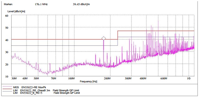 某產(chǎn)品在進(jìn)行RE 測(cè)試時(shí), 設(shè)備應(yīng)滿足的限值線為 CLASS B。 測(cè)試按測(cè)試組網(wǎng)圖搭建相應(yīng)的測(cè)試環(huán)境,接了電源線和信號(hào)線。上電后測(cè)試發(fā)現(xiàn)輻射超標(biāo),在高頻多處出現(xiàn)輻射超標(biāo)現(xiàn)象。 測(cè)試結(jié)果如下圖: