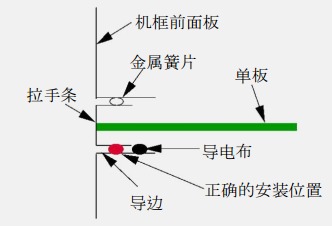 再檢查拉手條之間的屏蔽措施,拉手條之間采取的是拉手條單邊(上面)加簧片的屏蔽措施,檢查簧片的質(zhì)量和壓接狀況,情況良好,應(yīng)該不是泄漏根源。 最后檢查拉手條和機(jī)框間的屏蔽措施,上面的拉手條和機(jī)框間采用的是屏蔽簧片,搭接情況良好。下面的拉手條和機(jī)框之間的電連接靠導(dǎo)電布實(shí)現(xiàn),導(dǎo)電布是貼在機(jī)框的導(dǎo)邊上,導(dǎo)邊的深度比拉手條的金屬邊要深,檢查時(shí)發(fā)現(xiàn)導(dǎo)電布貼的太靠里,拉手條在安裝時(shí),根本沒(méi)有和機(jī)框之間形成良好的電接觸,具體的結(jié)構(gòu)如下圖所示。