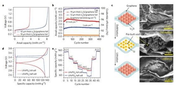 圖四, 硅鋰合金-石墨烯柔性電極的電化學(xué)性能。 (Nature Nanotech., 2017, 12, 993–999) 文章轉(zhuǎn)載自網(wǎng)絡(luò),如有侵權(quán),請(qǐng)聯(lián)系刪除。 |