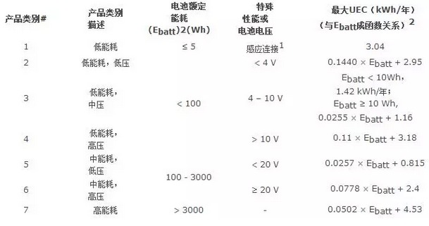 根據(jù)充電電池的容量及電壓,DOE 能效法規(guī)將電池充電器劃分為7種不同類別,并制定出相應(yīng)電池充電器的單位能量消耗(UEC)限值要求,即電池充電器的年能源消耗量。電池充電器的單位能量消耗(UEC)是以電池能量(Ebatt) 的函數(shù)公式,它反映的是電池充電器在所有工作模式下所消耗的無用能量(即,充電過程中所消耗的但未傳輸至電池的能量)。