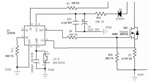 R11為lC工作頻率調(diào)整電阻, 02為輔助繞組供電整流二極管 R14為限流電阻, C5為低頻濾波電容, C11為高頻濾波電容, R3為過功電阻, R8為驅(qū)動(dòng)電阻, R12 MOS開機(jī)保護(hù)電阻, C12為旁路電容, U3-B為光耦反饋端,