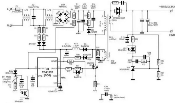以NXP的TEA1832圖紙做說明。分析電路參數(shù)設(shè)計與優(yōu)化并到認(rèn)證至量產(chǎn)。所有元器件盡量選擇電源適配器公司現(xiàn)有的或者量大的元件,方便后續(xù)降成本。