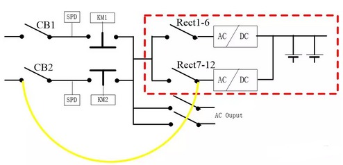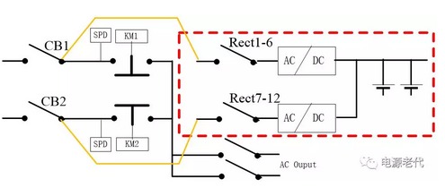 | 在處理完一次鐵路電源系統(tǒng)ATS故障后,曾向鐵路系統(tǒng)維護人員提出這樣一個優(yōu)化方案:電源適配器整流模塊全實時在線,更是大大提高系統(tǒng)可靠性! 改造前原系統(tǒng)方案如下: ![]() 圖5.1 電源適配器CC級ATS組成系統(tǒng)示意圖 圖5.1為艾默生網(wǎng)絡(luò)能源有限公司PS48600-3/2900-X4系統(tǒng)示意圖,可看出:電源適配器輸入兩路交流市電經(jīng)CC級ATS后到交流母線,交流有幾個支路帶交流負(fù)載,其余主要是給直流系統(tǒng)用(如紅色框中部分); 直流系統(tǒng)是整個電源的核心,需要優(yōu)先保證其可靠性;而直流系統(tǒng)的交流輸入經(jīng)與ATS串聯(lián)后,可靠性大大下降。 5.2 改造后系統(tǒng)方案如下: 5.2.1 兩路市電經(jīng)原電源適配器系統(tǒng)主空氣開關(guān)CB1、CB2后仍接ATS; 5.2.2 艾默生防雷接在ATS前端,且每路市電配一個,所以防雷部分利舊; 5.2.3 原ATS輸出到整流模塊輸入空開匯流排的線&整流模塊輸入空開匯流排拆除; 5.2.4在ATS上端子或CB1輸出端子分別引輸入電纜,直接連到各整流模塊輸入空氣開關(guān); 5.2.5 改造后,只要市電1、市電2任一路有電或都有電,直流母排始終有電,無任何切換,最重要的部分可靠性大大提高! 改造后的系統(tǒng),因兩路完全在線,對電池要求可降低; 改造后,ATS觸點不走大電流,ATS自身故障率將降低,也提高交流負(fù)載供電可靠性! ![]() 圖5.2 改造后系統(tǒng)原理示意圖 電源適配器改造方案說明(只是說明工作量和原理) 圖5.3 改造示意圖 保證電源適配器模塊1-6和7-12位置均有相近數(shù)量的模塊;因兩路市電一路優(yōu)先,因此一般是市電一工作;斷開CB2及CB2上級空氣開關(guān),斷開Rect7-12模塊輸入空氣開關(guān)(依據(jù)負(fù)載功率,可以是兩只或三只甚至更多),接圖5.3中黃線所示位置接線;接好線后繼續(xù)保持Rect7-12空氣開關(guān)斷開(改線的幾個都保持?jǐn)嚅_); 電源適配器送CB2上級交流電、維持CB2、Rect2空開斷開狀態(tài):此時,不管ATS狀態(tài),只要交流2有電,負(fù)載就一直正常; 5.3.3 斷開CB1及上級空氣開關(guān),接圖5.3.3綠色線示意,接模塊1-6電纜; ![]() 圖5.3.3電源適配器接線過程 在5.3.3電源適配器部分接線完成,合CB1及上級空開,此時模塊1—6工作將正常,此時系統(tǒng)結(jié)構(gòu)將如5.3.4所示; 5.3.4 接線過程 5.3.5 將CB2及上級空開斷開,同理接Rect7-12模塊空開至CB2下端子線,接好后如圖5.3.5所示,送CB2及上級空開,模塊7-12將正常工作; 圖5.3.5 接線完成后 5.3.6 至此,改造順利完成; 文章轉(zhuǎn)載自網(wǎng)絡(luò),如有侵權(quán),請聯(lián)系刪除。 |