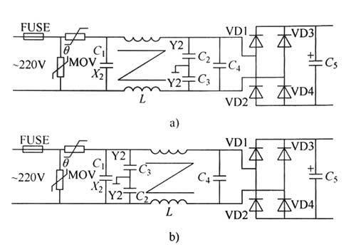 電源浪涌電流抑制電路 上電時,由于濾波電容器的電壓基本為零(相當(dāng)于短時短路),如果正好是電源適配器電壓峰值,則輸入電流峰值為輸入浪涌峰值電流值,為輸入電壓峰值除以線路內(nèi)阻,線路內(nèi)阻通常很小,將產(chǎn)生數(shù)10倍正常電流的浪涌電流,即使在城市民用供電條件下,浪涌電流峰值將達(dá)100A,即使在電源適配器電壓過零時上電仍有約10倍的浪涌電流。 上電浪涌電流的危害:出現(xiàn)浪涌電流時造成電源適配器電壓波形塌波,造成供電質(zhì)量變差,甚 至?xí)绊懫渌秒娫O(shè)備的工作以及供電電流的保護(hù)電路動作:由于浪涌電流的沖擊整流器輸入熔斷器在若干次上電過程的浪涌電流沖擊而非過載/短路熔斷?為避兔這類現(xiàn)象發(fā)而不得不選用更高額定電流的熔斷器,但將出現(xiàn)過載時熔斷器不能熔斷,起不到保護(hù)整流及用電電路的作用;過高的上電浪涌電流對整流器和濾波電容器造成不可逆的損壞?因必須對帶有電容濾波的整流器輸入浪涌電流加以限制?
