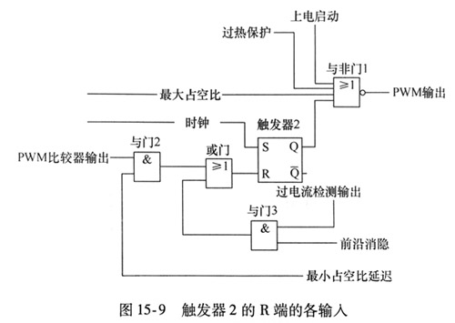 維持觸發(fā)器2的R端低電平的條件 觸發(fā)器2的S端置位脈沖過后,維持開關(guān)管導(dǎo)通需要清零端維持低電平?其條件為PWM比較器輸出低電平或最小占空比輸出低電平?過電流比較器輸出低電平?前沿消隱低電平?