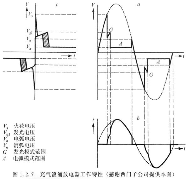 充氣浪涌放電器 大得多的瞬變電流可由各種氣體放電抑制器進(jìn)行處理。在這類抑制器中,兩個或更多的電極在密封的高壓情性氣體環(huán)境里被精確地設(shè)置了間距。當(dāng)放電器兩端電壓超過起弧電壓時,電極之間首先發(fā)生電離輝光放電。隨著電流的增大,會發(fā)生電弧放電,這就為所有的內(nèi)部電極之間提供了一條低阻抗的通道。在此模式下,放電器有一條電壓幾乎恒定的傳導(dǎo)路徑,典型的電弧壓降是25V,放電器的特性見圖1.2.7。注意到其特點(diǎn)是高起弧電壓和低電弧壓降。 當(dāng)沖擊電壓到來時,放電器電極僅維持很小的電壓,有效地短路電源適配器。此工作模式的內(nèi)部損耗很小,一個相當(dāng)小的器件也能承擔(dān)兒千安培的電流。使用這種類型的抑制器,保護(hù)作用不是把能量消耗在器件的內(nèi)部而是器件的短路作用,短路迫使瞬變能量消耗在電力線和濾波器的串聯(lián)電阻上。