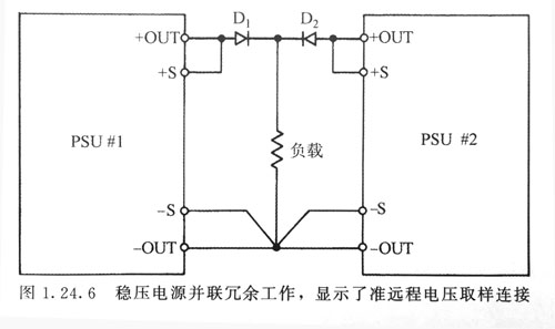 在并聯(lián)冗余工作中不推薦使用遠(yuǎn)程電壓取樣,因?yàn)檫h(yuǎn)程連接將會(huì)在直流電源適配器出現(xiàn)故障時(shí)提供交流電流通路。如果供電導(dǎo)線的電壓降是一個(gè)問(wèn)題,那么二極管應(yīng)安裝在負(fù)載端,遠(yuǎn)程電壓取樣單獨(dú)接到二極管的陽(yáng)極,見(jiàn)圖
