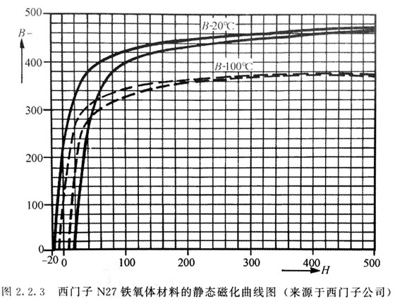 該例中,使用圖2。2。2中的圖表得到了磁心尺寸初始選擇。反激變換器的容許功率為130W,在圖中對(duì)應(yīng)為“E42/20”(圖中對(duì)應(yīng)的是20kHz工作頻率;30kHz時(shí),磁心的額定功率會(huì)高些)。 圖中顯示了N27鐵氧體(一種典型的變壓器材料)的靜態(tài)磁化曲線。