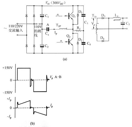 (a)半橋推挽正激變換器的功率部分 (b)半橋正激變換器的集電極電壓和電流波形
