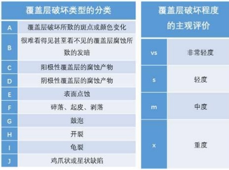 RP—保護評級值; RA—外觀評級值; A—計算RP時,為基體金屬腐蝕部分占總面積的百分比;計算RA時,為保護層腐蝕部分占總面積的百分比。 覆蓋層分類及主觀評價 保護評級的表示方法為:RA/— 如:輕微生銹超過表面1%,小于表面2.5%時,表示為:5/ — 外觀評級的表示方法為:—/RA值+主觀評價+覆蓋層破壞等級 如:中度起斑點,面積超過20%,表示為:—/2mA性能評級的表示方法為:RA值+主觀評價+覆蓋層破壞等級如:試樣未出現(xiàn)基體金屬腐蝕,但出現(xiàn)小于總面積的1%的陽極性覆蓋層的輕度腐蝕,表示為10/6sC