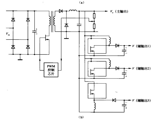 | 如下圖所示為一個(gè)傳統(tǒng)的離線式多路輸出電源適配器。交流電被整流電路整流(有的電路使用功率因素校正,有的電路不使用),然后利用某種拓?fù)潆娐罚ò霕?、全橋、正激或反激變換器)產(chǎn)生一個(gè)精確控制的以輸出地為參考的主輸出電壓。該主輸出一般為最大電流的輸出,輸出電壓通常為+5V,因?yàn)樗佑蟹答伃h(huán)電路,能及時(shí)調(diào)整輸入開關(guān)管的導(dǎo)通時(shí)間,所以它能很好地對(duì)網(wǎng)壓和負(fù)載電流的變化進(jìn)行調(diào)節(jié)。 通過增加變壓器次級(jí)繞組的數(shù)量得到輔助輸出(也稱輔輸出),選擇合適的次級(jí)繞組匝數(shù)以得到所要求的輔助輸出直流電壓。由于輔助次級(jí)輸出與主次級(jí)輸出變換器開關(guān)時(shí)間相同所以經(jīng)各自LC濾波器輸出的輔助直流電壓也能很好地適應(yīng)網(wǎng)壓變化。 但輔助輸出并不能很好地適應(yīng)主輸出或其自身負(fù)載電流的變化,其對(duì)負(fù)載變化的調(diào)整率一般只能達(dá)到±5%~8%。若允許主輸出或輔助輸出的電感進(jìn)入不連續(xù)工作模式,則對(duì)負(fù)載變化的調(diào)整率只能達(dá)到50%。另外,因?yàn)檩o助輸出最小的改變也要增加或減少一匝次級(jí)繞組,所以輔助輸出的直流電壓不能精確設(shè)計(jì)。由法拉第定律 可知,每匝伏數(shù)與開關(guān)頻率成比例,高頻下根據(jù)磁密和鐵心面積不同,每匝伏數(shù)E/N的值可能達(dá)到2~3V。這些輔助輸出電壓在位置上離主功率變壓器很近,并用導(dǎo)線連接到其使用位置。 一般來說因?yàn)檩o助輸出繞組往往用來給運(yùn)放或計(jì)算機(jī)外圍設(shè)備的電動(dòng)機(jī)供電,它們均能耐受較大的輸出電壓波動(dòng),所以輔助輸出電壓對(duì)網(wǎng)壓和負(fù)載變化調(diào)整率較差以及不能精確設(shè)定直流輸出電壓的值也并非大問題。 但如果要求輔助輸出有精確電壓輸出和良好調(diào)整率時(shí),就必須對(duì)輔助輸出使用獨(dú)立反饋環(huán)控制。常用的做法是:需要較小電流輸出時(shí),在較差調(diào)整的輔助輸出后級(jí)接線性調(diào)整器;需要較大電流時(shí)接Buck調(diào)整器或磁性放大器。 因?yàn)榉植际?a href="http://m.haikoo.cn/" target="_blank">電源適配器解決了輔助輸出電壓難以精確控制的問題,并且還有其他一些明顯的優(yōu)點(diǎn),所以分布式電源適配器可以替代傳統(tǒng)多路輸出電源適配器。圖所示為分布式電源適配器的一種拓?fù)浣Y(jié)構(gòu)。 分布式電源適配器的優(yōu)勢(shì)在于產(chǎn)生了一個(gè)集中的直流母線電壓(并不需要精確調(diào)節(jié)),它可向有需要的位置供電,然后接調(diào)節(jié)性能良好的DC/DC變換器芯片—Buck、Boot或極性轉(zhuǎn)換變換器(將它轉(zhuǎn)換為所需的電壓)。前述的LTC公司和 Maxim公司的芯片是這種分布式電源適配器設(shè)計(jì)的很好選擇。 如圖所示的一種分布式電源適配器電路就具有以下許多優(yōu)點(diǎn)。在圖中,提供最大電流的輸出端電壓一般是+5V,直接由主功率變壓器產(chǎn)生,并且這個(gè)主功率變壓器只有一個(gè)次級(jí)。它由反饋環(huán)控制,在輸出端采樣,控制輸入端的功率品體管的導(dǎo)通時(shí)間。所有其他的輸出由 Boost變換器或極性轉(zhuǎn)換變換器得到,每個(gè)輔助輸出都有自己的反饋環(huán)。在圖中,所有的輔助輸出都由LTc1174 Boost變換器產(chǎn)生,它的優(yōu)點(diǎn)如下。