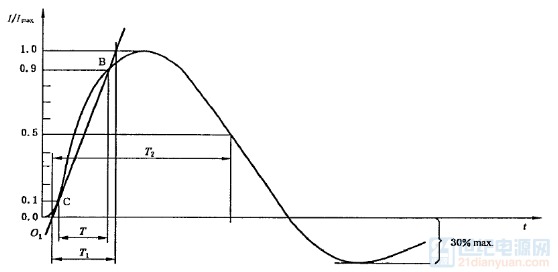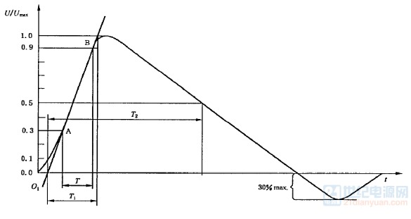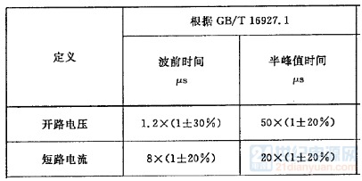 | 首先介紹一下什么是浪涌。浪涌一般是在開關(guān)瞬態(tài)或者雷電瞬態(tài)過程中產(chǎn)生的。 浪涌測試的官方叫法是“浪涌(沖擊)抗擾度實(shí)驗(yàn)”; 測試標(biāo)準(zhǔn)參考IEC61000-4-5,或者GB/T 17626.5;該標(biāo)準(zhǔn)里面有詳細(xì)闡述了有關(guān)浪涌的知識(shí)。 我們在測電源適配器浪涌時(shí),由浪涌發(fā)生器輸出的波形是一種組合波:1.2/50us電壓波(開路電壓)和8/20us電流波(短路電流),發(fā)生器的等效阻抗是2歐姆,用開路電壓峰值除以短路電流峰值就是該等效阻抗。具體波形參考下面兩圖: 1.2/50us開路電壓波,1.2us是波形的上升時(shí)間,具體指波形從10%上升到90%所用的時(shí)間,50us是半峰值時(shí)間,具體指波形上升至50%到波形下降至50%的時(shí)間,用示波器測量設(shè)備的開路波形就是這樣的。 ![]() 8/20us短路電流波,8us是波形的上升時(shí)間,20us是半峰值時(shí)間,具體定義同上,將設(shè)備的輸出端短路,測試短路電流就是這樣的波形。 ![]() 這幾個(gè)時(shí)間及開路電壓峰值、短路電流的誤差見下表: