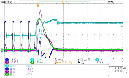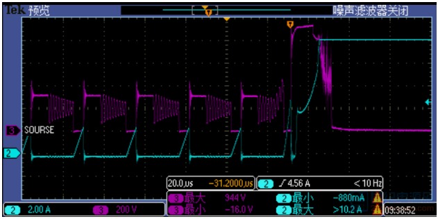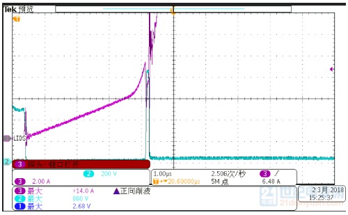 最后對比兩個(gè)設(shè)備的波形發(fā)現(xiàn),一個(gè)偏上限,一個(gè)偏下限,都沒有超出標(biāo)準(zhǔn)范圍。其實(shí)標(biāo)準(zhǔn)范圍大了,方便了造設(shè)備的。 今天剛給一個(gè)LED電源適配器打完4kV浪涌,附上4kV浪涌時(shí),MOS管的波形,供參觀,下次再見: ![]() CH1-深藍(lán)色-VGS波形, CH2-淺藍(lán)色-VDS波形,最大816V, CH3-紫色-IDS波形,最大10.4A, CH4-綠色-L線電流波形,最大800A。 LED八字尾電源適配器-單級(jí)PFC結(jié)構(gòu),由于沒有大電解,在打浪涌時(shí),浪涌能量很容易傳遞到功率MOS上。浪涌對MOS管的沖擊失效一般有兩種失效模式: 1-浪涌引起MOSFET 電流應(yīng)力超過額定值,導(dǎo)致失效; 根據(jù)伏秒平衡定律,反激開關(guān)電源適配器變壓器電感: 公式1 ![]() 其中Von=Vin,D為占空比,r=0.3-0.5,fsw指開關(guān)頻率,IL是電感電流。Von一般最大277Vac或者300Vac,但是在浪涌脈沖測試時(shí),由于母線電壓突然升高,超過設(shè)計(jì)輸入電壓最高值1.2倍或者更多,變壓器電感會(huì)迅速出現(xiàn)飽和。下圖1中紫色電流在開關(guān)周期后階段出現(xiàn)飽和跡象,MOSFET電流應(yīng)力迅速上升達(dá)到7.32A。在正常開關(guān)周期,MOSFET IDS=3A。器件在高電流、高電壓應(yīng)力發(fā)生雪崩,MOSFET失效,表現(xiàn)為短路,引起開關(guān)電源適配器輸入端保險(xiǎn)絲,整流橋和驅(qū)動(dòng)IC失效。 ![]() ![]() 圖1浪涌測試 紫色MOSFET IDS 黃色是VDS 圖2浪涌測試 紫色VDS電壓 ,藍(lán)色是IDS SJ-MOSFET 0.3Ω/700V 10A80E VD-MOSFET EAS=454mJ 2-浪涌引起MOSFET 電壓應(yīng)力超過極限值,導(dǎo)致失效 開關(guān)電源適配器在浪涌測試時(shí),由于前端浪涌吸收器件(壓敏電阻等)規(guī)格參數(shù)偏小導(dǎo)致母線電壓迅速爬升,進(jìn)而導(dǎo)致MOSFET電壓應(yīng)力迅速超過額定電壓1.1-1.2倍,MOSFET器件會(huì)迅速進(jìn)入雪崩,IDS電流瞬間變大,導(dǎo)致器件功耗急劇增加,巨大的功耗轉(zhuǎn)換為溫升超過芯片極限溫度而引起失效。如圖2所示,60W 單級(jí)PFC LED電源適配器, 1.5KV 差模浪涌測試失效波形。結(jié)合圖3更準(zhǔn)確說明此類問題,圖3所示黃色曲線電壓低于680V時(shí),MOSFET處在關(guān)斷狀態(tài),IDS幾乎等于0;一旦超過680V,MOS管反向擊穿,電壓被嵌位,IDS電壓迅速爬升,最終器件由于熱量失控而導(dǎo)致失效。 ![]() ![]() 圖316N65A VD-MOSFET EAS=1000mJ 圖416N65A 規(guī)格書極限參數(shù) EAS=1000mJ 黃色線是MOSFETVDS電壓,藍(lán)色是IDS 浪涌失效瞬間,MOSFET短路,隨后繼續(xù)流過大電流,燒毀其他器件,尤其是采樣電阻最易燒壞,再燒斷保險(xiǎn)司或者其他線路,使電源適配器與輸入斷開。 一般都是芯片被嚴(yán)重?zé)齻?,見下圖。 ![]() 圖5 浪涌失效芯片外觀 圖6 浪涌失效芯片外觀