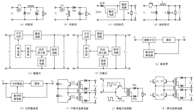| 現(xiàn)在,電子技術(shù)及其應(yīng)用,對(duì)電子儀器和設(shè)備的要求是:在性能上更加安全可靠,在功能上不斷地增強(qiáng),在使用上自動(dòng)化程度越來(lái)越高,在體積上要日趨小型化。這使采用具有眾多優(yōu)點(diǎn)的開(kāi)關(guān)穩(wěn)壓電源適配器就顯得更加重要了。所以,90W電源適配器在計(jì)算機(jī)、通信、航天、家電等方面都得到了越來(lái)越廣泛的應(yīng)用,發(fā)揮了巨大的作用,這大大促進(jìn)了開(kāi)關(guān)穩(wěn)壓電源適配器的發(fā)展,從事這方面研究和生產(chǎn)的人員也在不斷地增加,開(kāi)關(guān)穩(wěn)壓電源適配器的品種和類型也越來(lái)越多。圖給出了各種類型開(kāi)關(guān)穩(wěn)壓電源適配器的原理圖。目前開(kāi)關(guān)穩(wěn)壓電源適配器的拓?fù)浣Y(jié)構(gòu)可分為以下幾類。 (1)按激勵(lì)方式分類 ①他激式開(kāi)關(guān)穩(wěn)壓電源適配器。電路中設(shè)有激勵(lì)信號(hào)的振蕩器,電路形式如圖所示。 ②自激式開(kāi)關(guān)穩(wěn)壓電源適配器。開(kāi)關(guān)管兼作振蕩器中的振蕩管,電路形式如圖所示。 (2)按調(diào)制方式分類 ①脈寬調(diào)制型開(kāi)關(guān)穩(wěn)壓電源適配器。振蕩頻率保持不變,通過(guò)改變脈沖寬度來(lái)改變和調(diào)節(jié)輸出電壓的大小,有時(shí)通過(guò)取樣電路、耦合電路等構(gòu)成反饋閉環(huán)回路來(lái)穩(wěn)定輸出電壓的幅度。 ②頻率調(diào)制型開(kāi)關(guān)穩(wěn)壓電源適配器。占空比保持不變,通過(guò)改變振蕩器的振蕩頻率來(lái)調(diào)節(jié)和穩(wěn)定輸出電壓的幅度。 ③混合調(diào)制型開(kāi)關(guān)穩(wěn)壓電源適配器。通過(guò)調(diào)節(jié)導(dǎo)通時(shí)間的振蕩頻率來(lái)完成調(diào)節(jié)和穩(wěn)定輸出電壓的幅度。 (3)按開(kāi)關(guān)管電流的工作方式分類 ①開(kāi)關(guān)型開(kāi)關(guān)穩(wěn)壓電源適配器。用開(kāi)關(guān)管把直流電變成高頻標(biāo)準(zhǔn)方波,電路形式類似于他激式。 ②諧振型開(kāi)關(guān)穩(wěn)壓電源適配器。開(kāi)關(guān)管與LC諧振回路將直流電變成準(zhǔn)正弦波,電路形式類似于自激式。 (4)空氣凈化器充電器按開(kāi)關(guān)管的類型分類 ①晶體管型開(kāi)關(guān)穩(wěn)壓電源適配器。采用晶體管作為開(kāi)關(guān)管,電路形式如圖所示。 ②可控硅型開(kāi)關(guān)穩(wěn)壓電源適配器。采用可控硅作為開(kāi)關(guān)管,這種電路的特點(diǎn)是直接輸入交流電,不需要一次整流部分,其電路形式如圖所示。 (5)按儲(chǔ)能電感與負(fù)載的連接方式分類 ①串聯(lián)型開(kāi)關(guān)穩(wěn)壓電源適配器。儲(chǔ)能電感串聯(lián)在輸入與輸出電壓之間,電路形式如圖所示。 ②并聯(lián)型開(kāi)關(guān)穩(wěn)壓電源適配器。儲(chǔ)能電感并聯(lián)在輸入與輸出電壓之間,電路形式如圖所示。 (6)按開(kāi)關(guān)管的連接方式分類 ①單端式開(kāi)關(guān)穩(wěn)壓電源適配器。電路中僅使用一個(gè)開(kāi)關(guān)管,這種電路的特點(diǎn)是價(jià)格低,結(jié)構(gòu)簡(jiǎn)單,但輸出功率不高,其電路形式如圖(a)、(b)和(d)所示。 ![]() ②推挽式開(kāi)關(guān)穩(wěn)壓電源適配器。電路中使用兩個(gè)開(kāi)關(guān)管,將其連接成推挽功率放大器形式。這種電路的特點(diǎn)是開(kāi)關(guān)變壓器必須具有中心抽頭,電路形式如圖(j)所示。 ③半橋式開(kāi)關(guān)穩(wěn)壓電源適配器。電路中使用兩個(gè)開(kāi)關(guān)管,將其連接成半橋形式。它的特點(diǎn)是適應(yīng)于輸入電壓較高的場(chǎng)合,電路形式如圖(i)所示。 ④全橋式開(kāi)關(guān)穩(wěn)壓電源適配器。電路中使用4個(gè)開(kāi)關(guān)管,將其連接成全橋形式。它的特點(diǎn)是輸出的功率比較大,其電路形式如圖(k)所示。 (7)按輸入與輸出電壓的大小分類 ①升壓式開(kāi)關(guān)穩(wěn)壓電源適配器。輸出電壓比輸入電壓高,實(shí)際上就是并聯(lián)型開(kāi)關(guān)穩(wěn)壓電源適配器。 ②降壓式開(kāi)關(guān)穩(wěn)壓電源適配器。輸出電壓比輸入電壓低,實(shí)際上就是串聯(lián)型開(kāi)關(guān)穩(wěn)壓電源適配器。 (8)按工作方式分類 ①可控整流型開(kāi)關(guān)穩(wěn)壓電源適配器。所謂可控整流型開(kāi)關(guān)穩(wěn)壓電源適配器,是指采用可控硅整流元件作為調(diào)整開(kāi)關(guān)管,可由交流市電電網(wǎng)直接供電,也可用變壓器變壓后供電(這種供電方式在開(kāi)關(guān)穩(wěn)壓電源適配器剛興起的初期常常采用,目前基本上不太采用)。在可工作的半波內(nèi),截去正弦曲線的前一部分,這一部分所占角度稱為截止角,導(dǎo)通的正弦曲線的后一部分稱為導(dǎo)通角。這種類型的開(kāi)關(guān)電源適配器依靠調(diào)節(jié)導(dǎo)通角的大小,可達(dá)到調(diào)整輸出電壓和穩(wěn)定電壓的目的,其電路如圖圖(h)所示。 ②斬波型開(kāi)關(guān)穩(wěn)壓電源適配器。斬波型開(kāi)關(guān)穩(wěn)壓電源適配器是指采用直流供電,直流輸入電壓加到開(kāi)關(guān)電路上,在開(kāi)關(guān)電路的輸出端得到單向的脈動(dòng)直流電,經(jīng)過(guò)濾波得到與輸入電壓不同的穩(wěn)定的直流電壓。電路還從輸出電壓取樣,經(jīng)過(guò)比較、放大,控制脈沖發(fā)生電路