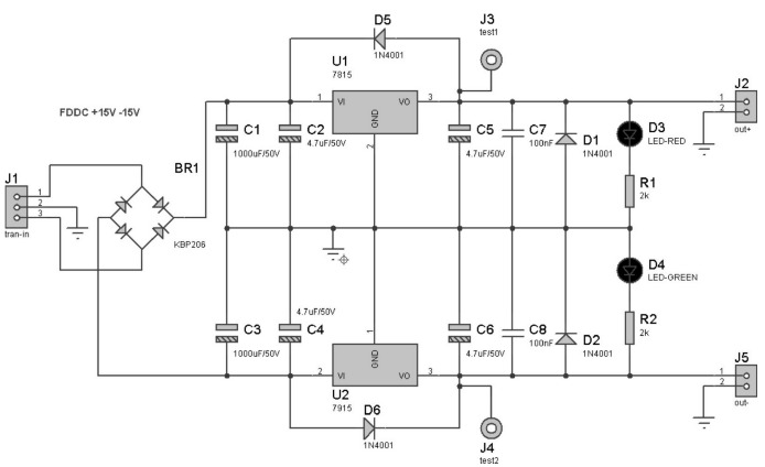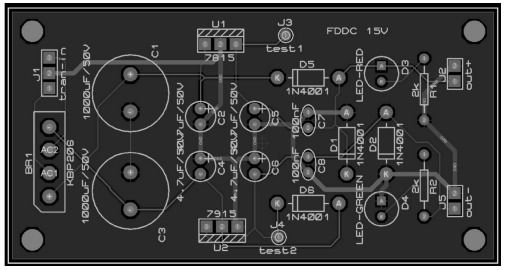 | 使用三端穩(wěn)壓器有以下優(yōu)點。 (1)元件數(shù)量少。 (2)帶有限流電路,輸出短路時不會損壞元件。 (3)帶有熱擊穿功能。 三端穩(wěn)壓器選擇7815、7915,在輸出端同時并入二極管D5、D6(型號為1N4001),當(dāng)三端穩(wěn)壓器未接入輸入電壓時可保護(hù)其不至于損壞。輸出端out3、out4分別可輸出+15V與-15V電壓,并驅(qū)動LED發(fā)光,穩(wěn)壓電路空載輸出仿真圖如圖所示。 ![]() 用圖表功能記錄穩(wěn)壓電路空載輸出,如圖所示。如圖所示,三端穩(wěn)壓器7815、7915可輸出穩(wěn)定±15V直流電壓。注意為了使三端穩(wěn)壓器7815、7915能夠正常工作,輸入電壓必須保證為18V。7815、7915正常工作時輸入輸出之間的電壓差必須在3V以上。為此,使用7815/7915時輸入電壓應(yīng)在18V以上,較大輸入電壓不超過35V。穩(wěn)壓器7815、7915輸出端out3、out4處接入2kΩ電阻與LED負(fù)載測試,仿真結(jié)果如圖3-12所示。穩(wěn)壓電路輸出為兩個穩(wěn)定的±15V電壓,輸出仿真結(jié)果如圖所示。 穩(wěn)壓器7815、7915輸出端out3、out4處接入10kΩ電阻與LED負(fù)載測試,仿真結(jié)果如圖所示。穩(wěn)壓電路輸出為兩個穩(wěn)定的±15V電壓,輸出仿真結(jié)果如圖所示。 ![]() 綜上所述,本項目所設(shè)計的固定式雙電源適配器直流穩(wěn)壓電源適配器,能夠在負(fù)載變化的情況下提供穩(wěn)定的±15V直流穩(wěn)壓電源適配器,滿足設(shè)計指標(biāo)。 固定式雙電源適配器直流穩(wěn)壓電路的整體電路原理圖如圖所示。 ![]() 圖整體電路原理圖 對電路板進(jìn)行實際測試,測試正電壓輸出為14.84V,負(fù)電壓輸出為-14.77V,設(shè)計要求輸出雙電源適配器±15V電壓,實測基本符合設(shè)計要求。 PCB版圖(見圖) ![]() 實物測試(見圖) ![]() 為了提高電子設(shè)備的精度及穩(wěn)定性,在直流電源適配器中還要加入穩(wěn)壓電路,因此稱為直流穩(wěn)壓電源適配器。典型的直流穩(wěn)壓電源適配器主要由電源適配器變壓器、整流電路、濾波電路和穩(wěn)壓電路等幾部分構(gòu)成。電源適配器變壓器把50Hz的交流電網(wǎng)電壓變成所需要的交流電壓;整流電路用來將交流電變換為單向脈動直流電;濾波電路用來濾除整流后單向脈動電流中的交流成分(即紋波電壓),使其成為平滑的直流電;穩(wěn)壓電路的作用是當(dāng)輸入交流電網(wǎng)電壓波動、負(fù)載及溫度變化時,維持輸出直流電壓的穩(wěn)定。本項目所介紹的雙電源適配器直流穩(wěn)壓電路與傳統(tǒng)的穩(wěn)壓電源適配器相比,具有操作方便、電壓穩(wěn)定度高等特點,其輸出電壓精確可測,控制部分電路簡單明了,可提供穩(wěn)定的±15V電壓輸出,滿足設(shè)計要求。