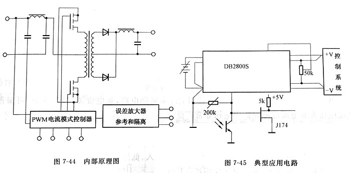 2內(nèi)部結(jié)構(gòu)及應(yīng)用電路 DB2800S系列的內(nèi)部結(jié)構(gòu)框圖如圖7-44所示。 圖7-45顯示了該電路的遙控特點(diǎn):減小了由于輸入給負(fù)載的導(dǎo)線電阻而引起的輸出誤差,也給出了非同步操作連接及輸出電壓微調(diào)、遙控關(guān)斷、錯(cuò)誤檢測(cè)、輸入電壓接通點(diǎn)調(diào)整電路。 ![]()