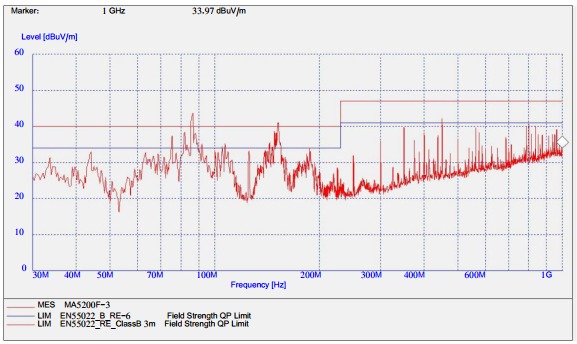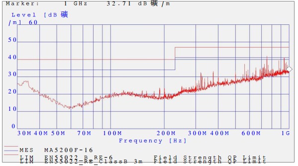 屏蔽插座與結(jié)構(gòu)搭接不良對屏蔽效能的影響 MA5200F 在進行 RE 測試時, 按照測試組網(wǎng)要求搭建環(huán)境, 機框前面板上連接各種業(yè)務(wù)線和調(diào)試用的控制線, 測試時發(fā)現(xiàn)輻射超標(biāo),在 70MHz~200MHz 之間輻射超標(biāo),超過限值線 4dB 左右,測試頻譜如下圖所示:
