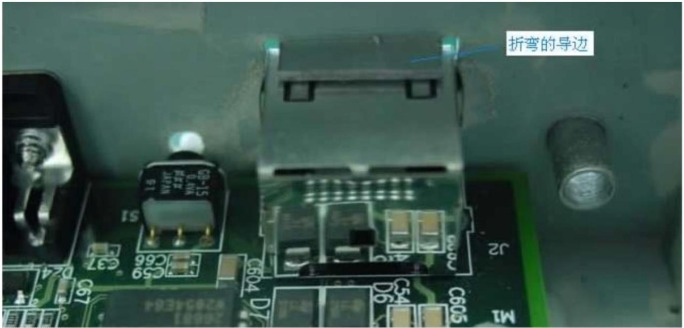 MA5200F 的屏蔽結(jié)構(gòu)為機箱級屏蔽, 針對輻射超標(biāo)現(xiàn)象, 拔掉所有業(yè)務(wù)線和控制線進行測試, 輻射超標(biāo)部分消失,因此確定為線纜的輻射。每根電纜逐一測試, 發(fā)現(xiàn)引起輻射超標(biāo)的是調(diào)試用的串口線和網(wǎng)線。網(wǎng)線和串口線使用的是屏蔽電纜,打開機箱檢查電纜插座的安裝, 發(fā)現(xiàn)電纜插座是焊接在機箱內(nèi)單板的 PGND 上, 單板的 PGND 通過螺釘連接到機箱上, 電纜插座金屬外殼四周的簧片和機箱之間涂了一層絕緣漆,造成電纜插座和機殼之間沒有有效的電連接, 這樣,金屬外殼上的從機箱內(nèi)部耦合的干擾就會通過電纜向外輻射。 實際處理時,我們將屏蔽插座的外殼和機箱外殼之間用銅箔粘在一起,處理后測試一次通過。 如下圖所示: