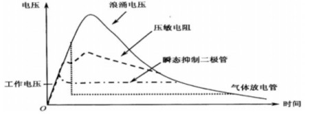 圖 20:浪涌沖擊通過(guò)不同的抑制器件時(shí)的電壓波形示意圖