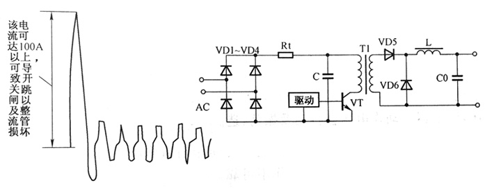 2-58合閘瞬間濾波電容電流波形圖 2-59熱敏電阻防沖擊電流電路