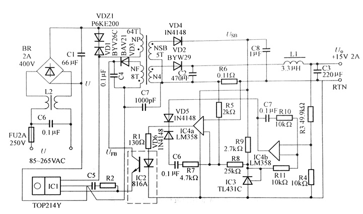 IC4a的同相輸入端接電流檢測信號UR6,反相輸入端接分壓器電壓Ufy?分壓器是由R5?R8和TL431C構成的?IC4a在將UB6與UFy進行比較之后,輸出誤差。信號U,再通過VD5和R1變成電流信號,流入光耦中的LED,進而控制TOP214Y的占空比,使電源的輸出電流Io在恒流區(qū)內維持恒定?顯然,VD5和VD6就相當于一個“或門”?