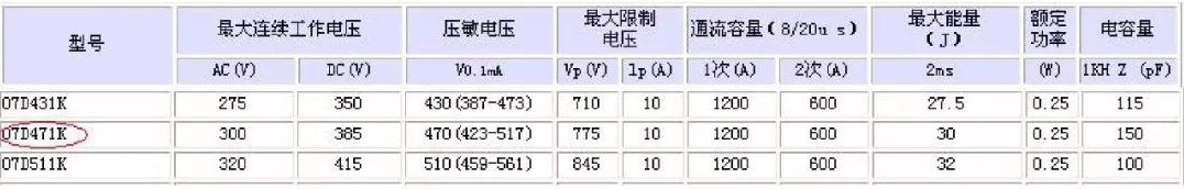 選取壓敏電阻的方法 結(jié)合前面所述,來看一下本電路中壓敏電阻的型號所對應(yīng)的相關(guān)參數(shù)。
