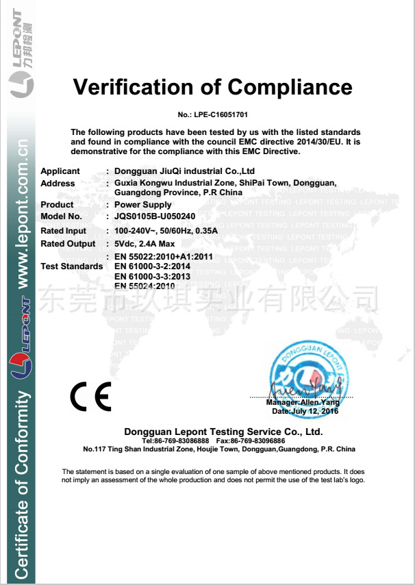 其次,了解下電源適配器的銘牌,所有CE認(rèn)證的電源適配器,其銘牌上的CE標(biāo)志高度一定是大于5mm,這是強(qiáng)制性的要求,另外新的CE標(biāo)準(zhǔn),銘牌上必須備注生產(chǎn)廠家的名稱及詳細(xì)地址。